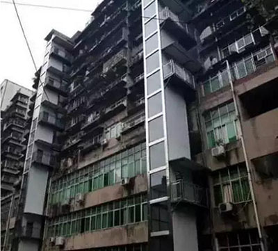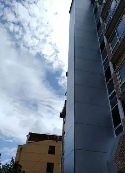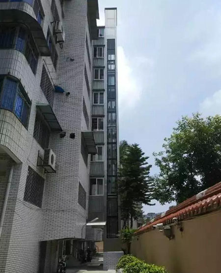 采用這種加裝方式大多是因?yàn)闃堑哪厦嫘枰^車等,這時(shí)候就可以考慮將電梯加裝在樓宇的陰面,徹底避免對(duì)采光和通風(fēng)的影響。